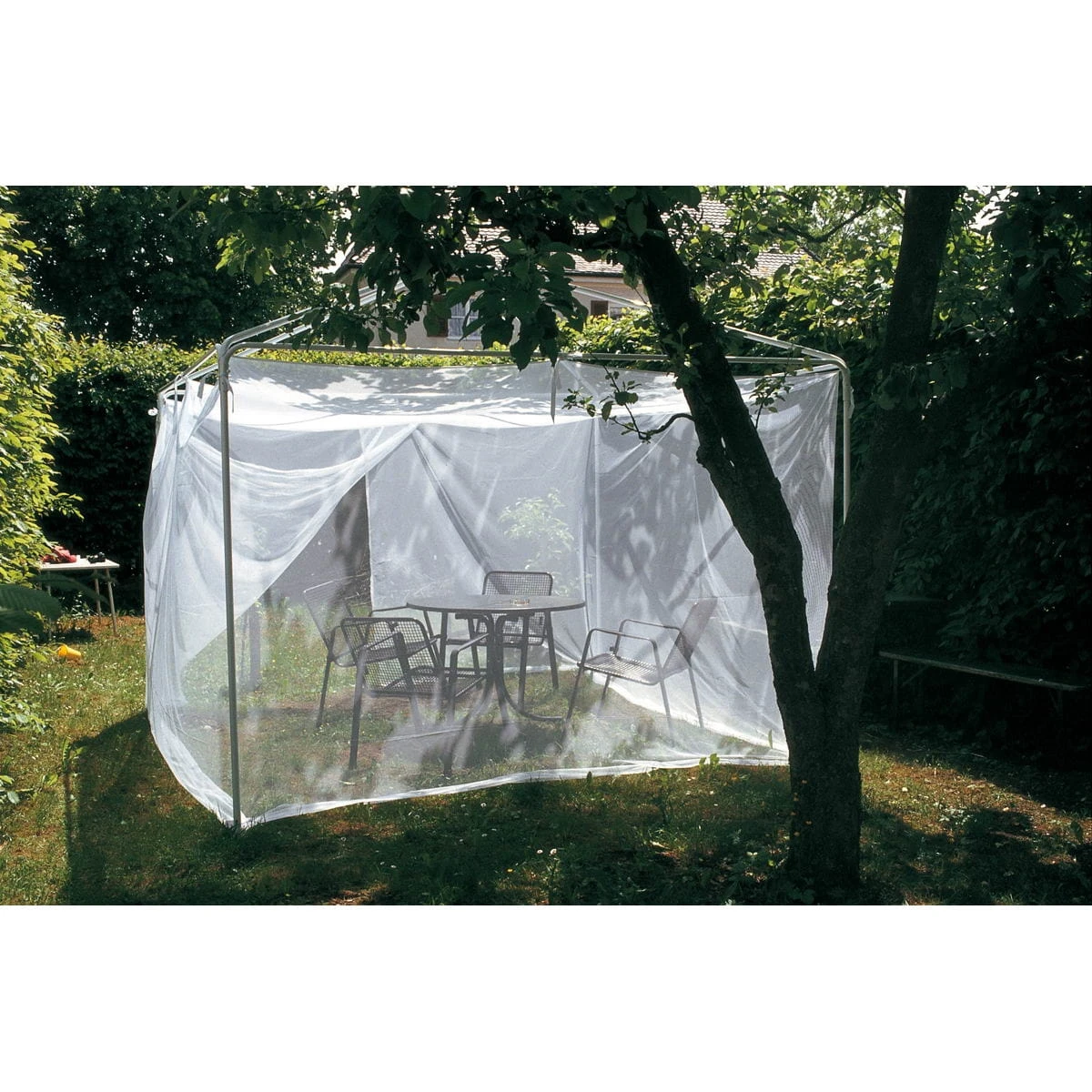 Das Größte: Das Mücken-Netz Lodge Terrazzo von Brettschneider passt über eine komplette Sitzgruppe und eignet sich perfekt, um z.B. den Sitzplatz auf der Terrasse zur insektenfreien Zone zu machen. Aber auch für den Sandkasten oder den Picknickplatz. Das Netz hat eine Eingangsöffnung und viele Befestigungsbänder. Es kann damit nach oben abgehängt werden.
