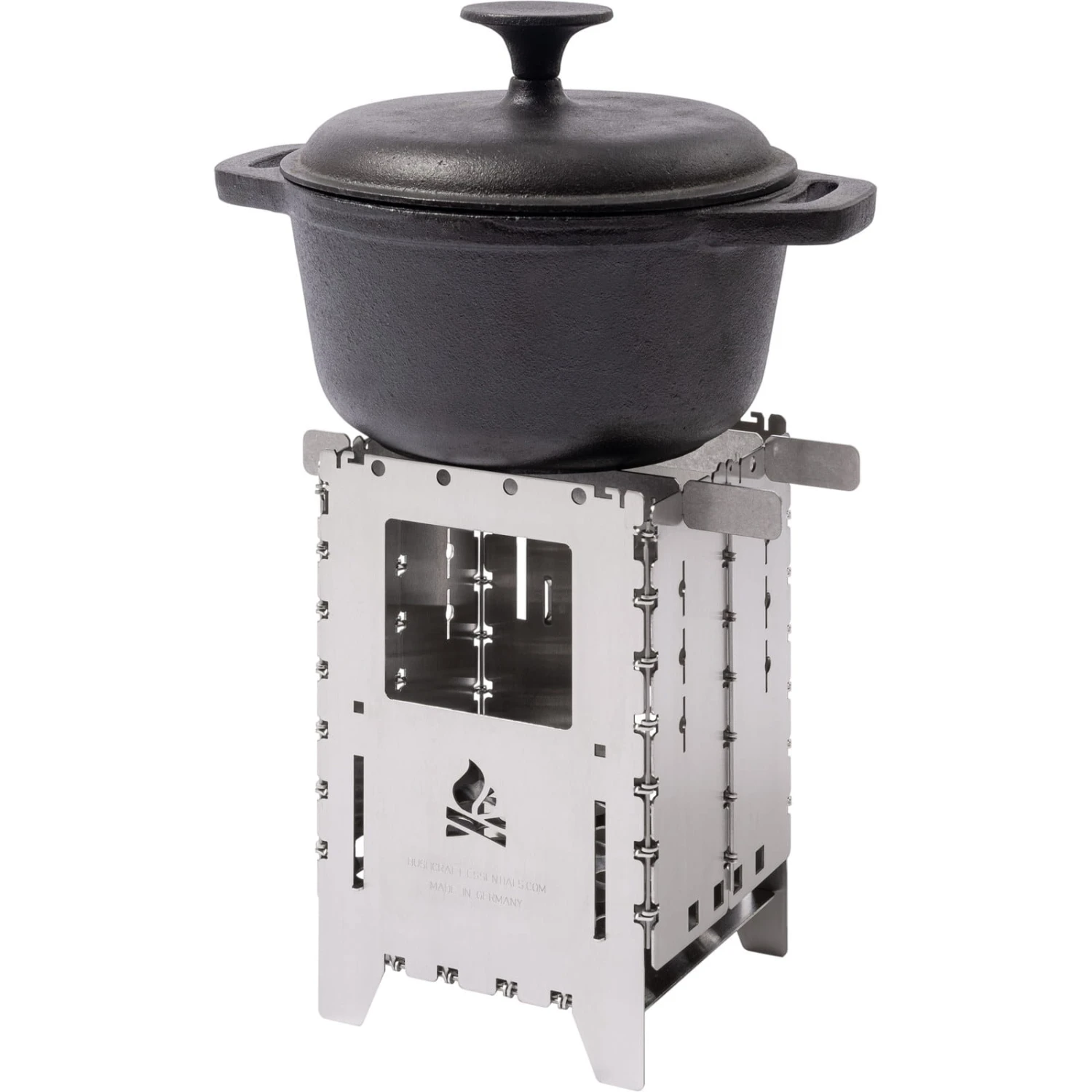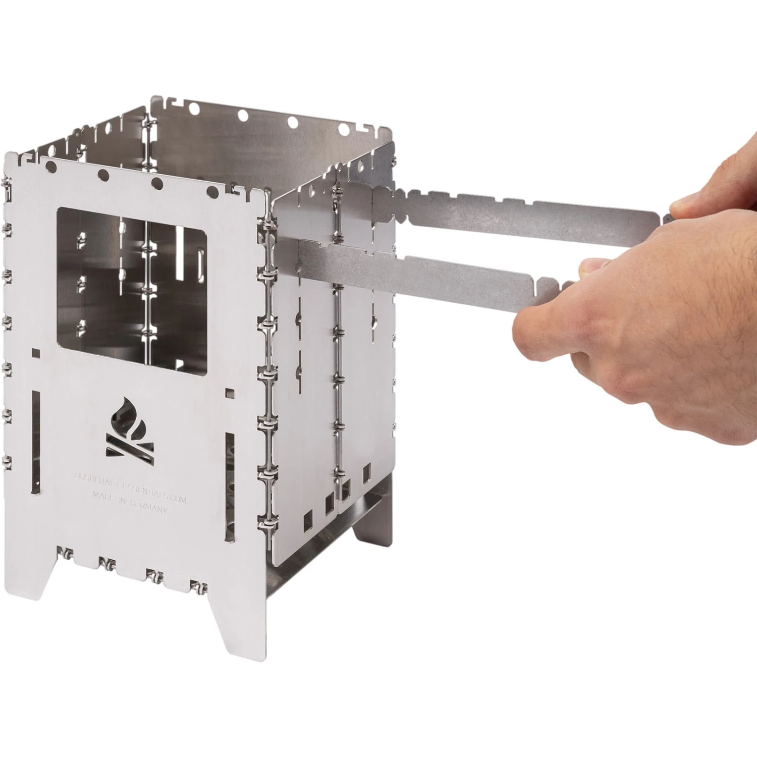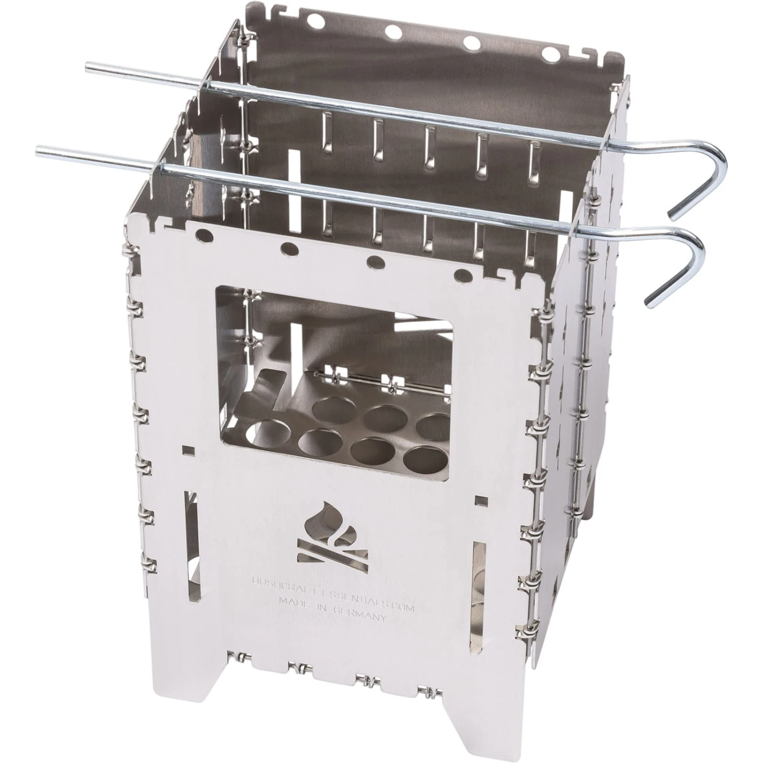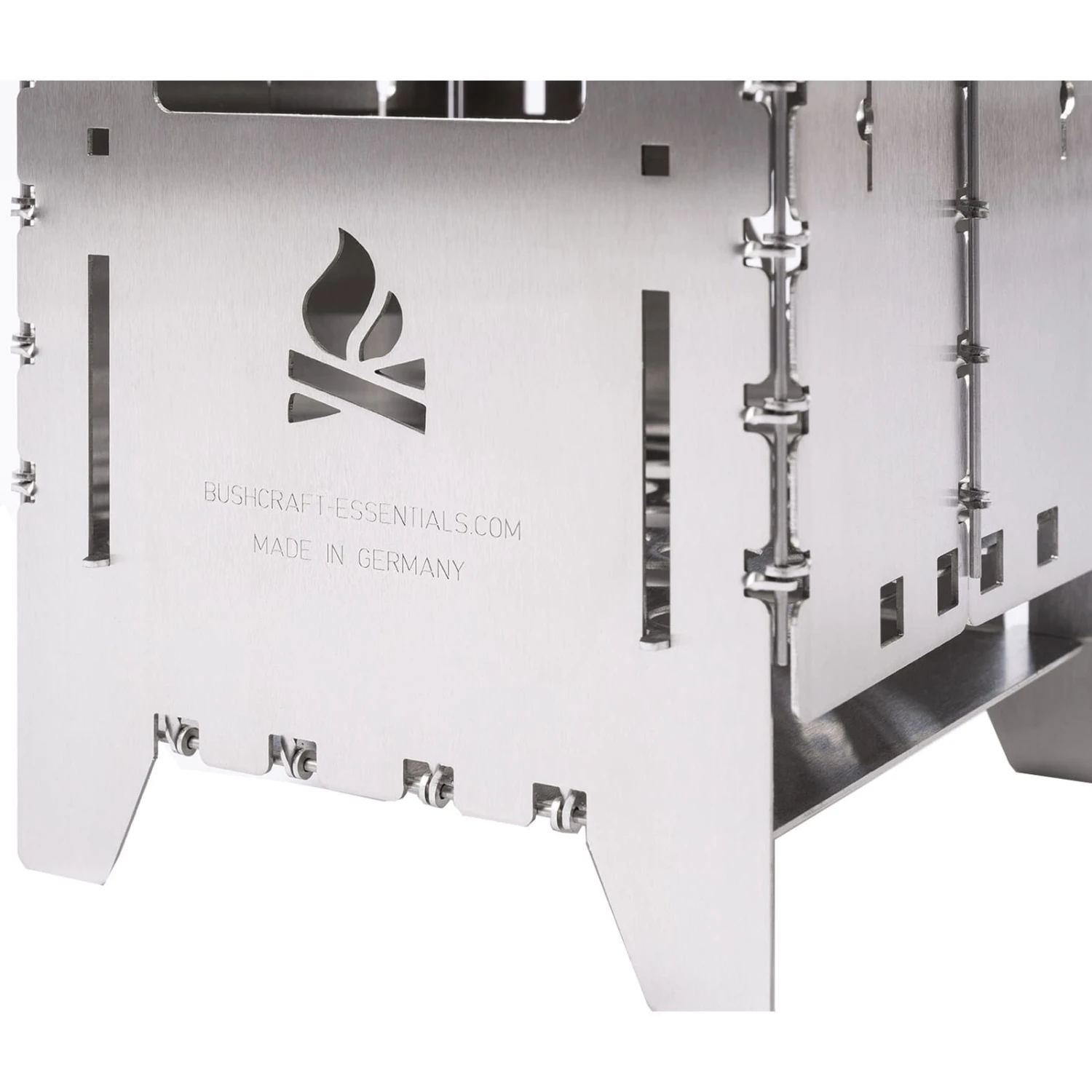 Der Bushbox XL von bushcraft essentials ist ein außerordentlich effizienter portabler Falt-Hobo-Kocher zum Grillen, Kochen, Wärmen. Zusammengefaltet nur ca. 1 cm dick. Perfekt für längere Outdoor-Trips, Camping, Trekking, Bushcraft, Biker, Expeditionen und und und… Unabhängig, vielfältig und einfach zu benutzen. Den Brennstoff gibt es kostenlos überall in der Natur – Zweige, Äste, Laub, Tierdung. Halteposition für Trangia Kocher. Zusammengeklappt ist dieser geniale Hobo-Ofen nur wenig dicker als 1 cm und lässt sich nahezu überall unterbringen. Der Bushbox XL wird an den Scharnieren einfach aufgeklappt und ist sofort einsatzbereit (er lässt sich auch mit Handschuhen oder klammen Händen problemlos aufbauen, was bereits auf Expeditionen unter Beweis gestellt wurde). Der Bushbox XL arbeitet nach dem Kamin-Prinzip: Luft strömt von unten in den Kocher, bringt sogar noch feuchtes Material zum Brennen und erzeugt starke Hitze, was weiter dadurch unterstützt wird, dass die Hitze im Gegensatz zu einer offenen Flamme kaum nach den Seiten abstrahlen kann und dadurch vorwiegend nach oben gelenkt wird. Der Bushbox XL ist ein Effizienzwunder. Schon mit wenigen kleinen Zweigen lässt sich Wasser in unter 4 Minuten zum Kochen bringen, Fleisch grillen, Essen zubereiten – und vieles mehr. Als Brennstoff kann neben praktisch jedem natürlichen bzw. festen Brennstoff wie Holz, Rinde, Holzkohle (sogar trockner Tierdung) auch ein Spiritusbrenner, Esbit-Tabletten oder ein Gel-Kocher verwendet werden. Durch zwei mitgelieferte Stäbe kann eine externe Wärmequelle (z.B. Trangia) auf jeder beliebigen Höhe in der Bushbox XL plaziert werden. Diese Stäbe lassen sich auch auf der Oberseite des Kochers einlegen, so dass auch kleine Gefäße erhitzt werden können. Die mitgelieferten, äußerst variabel einsetzbaren Topfauflagen können alternativ verwendet werden als Höhenregulierung beim Einsatz anderer Wärmequellen, Haltestäbe zum Transport oder Versetzen des heißen Kochers und Halterung für den Trangia-Brenner.