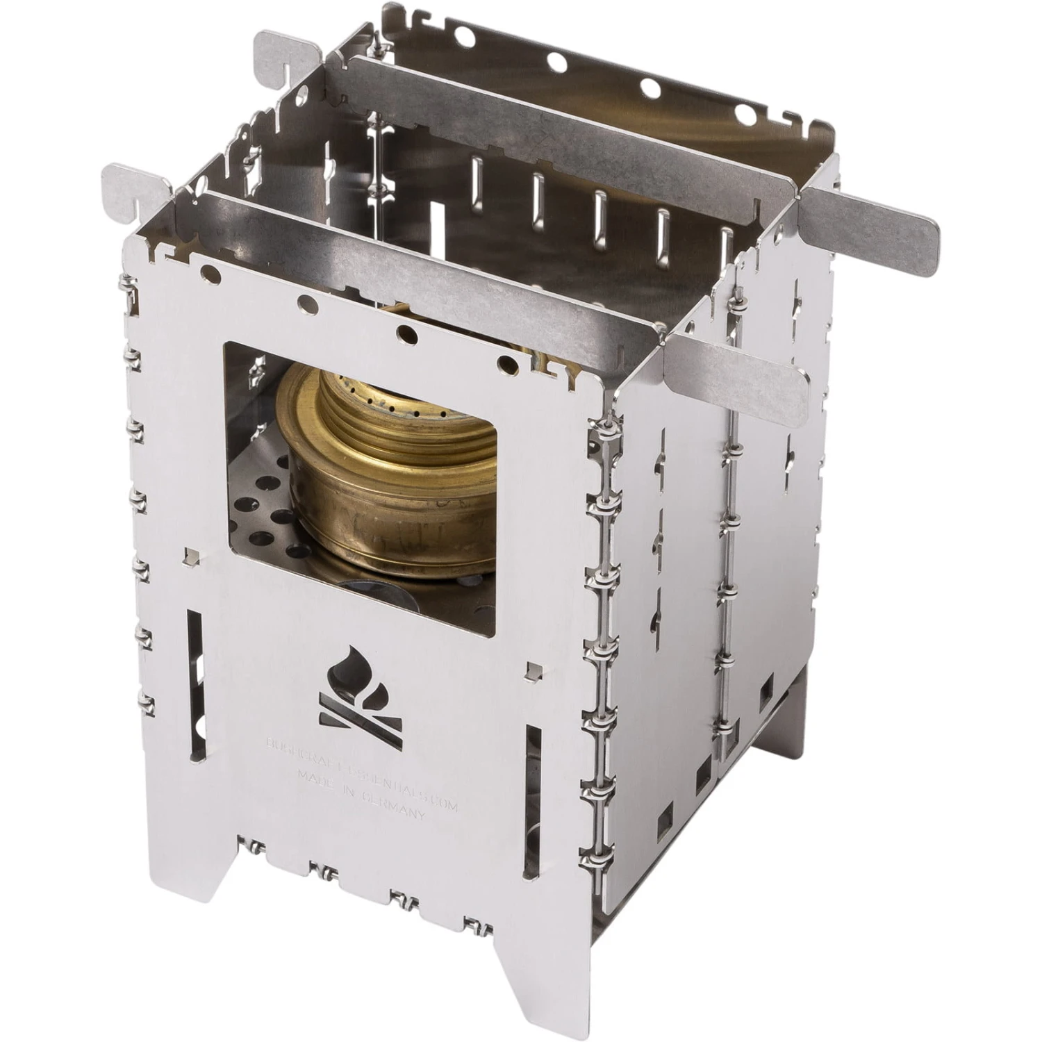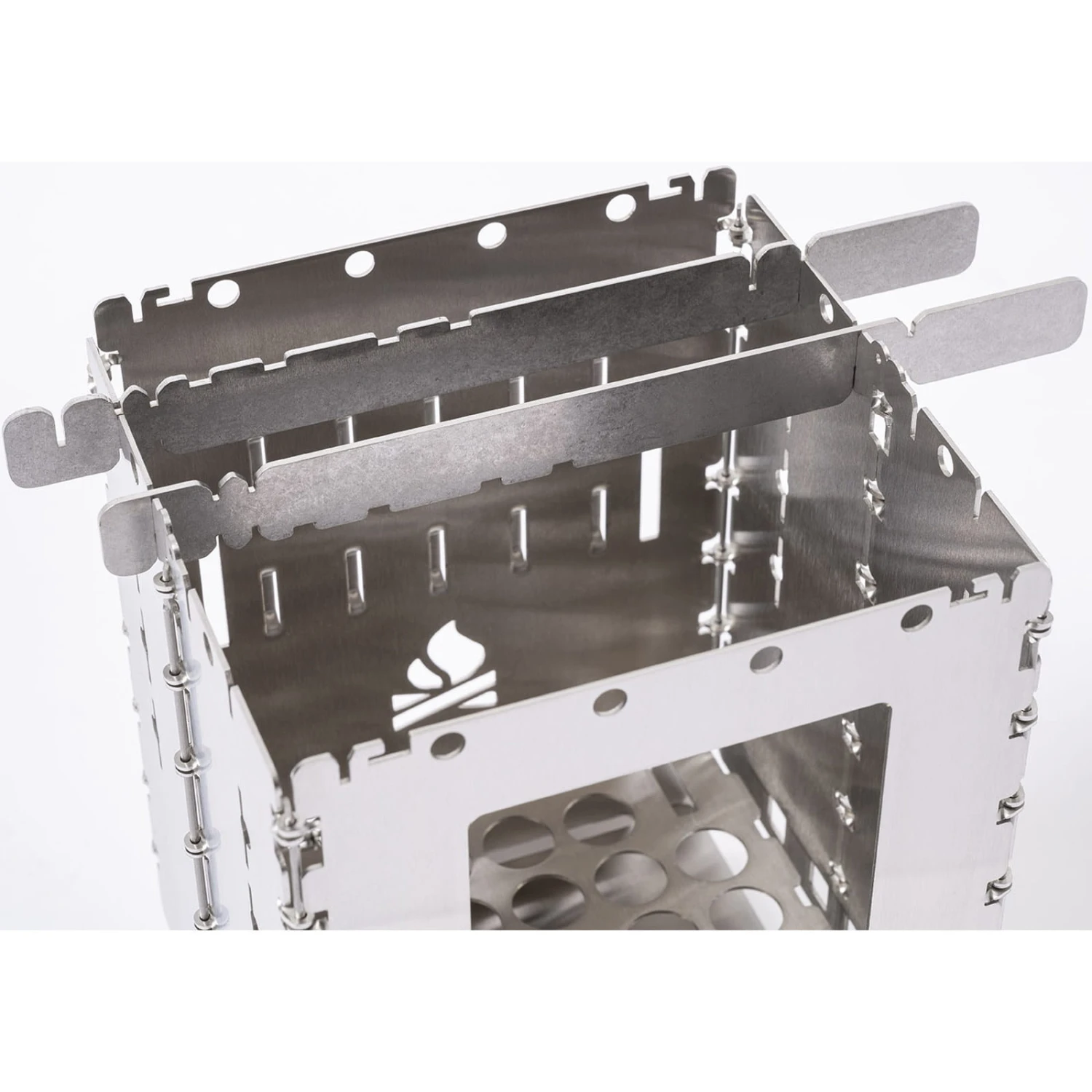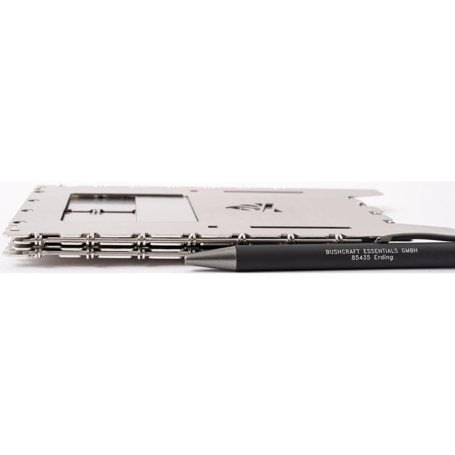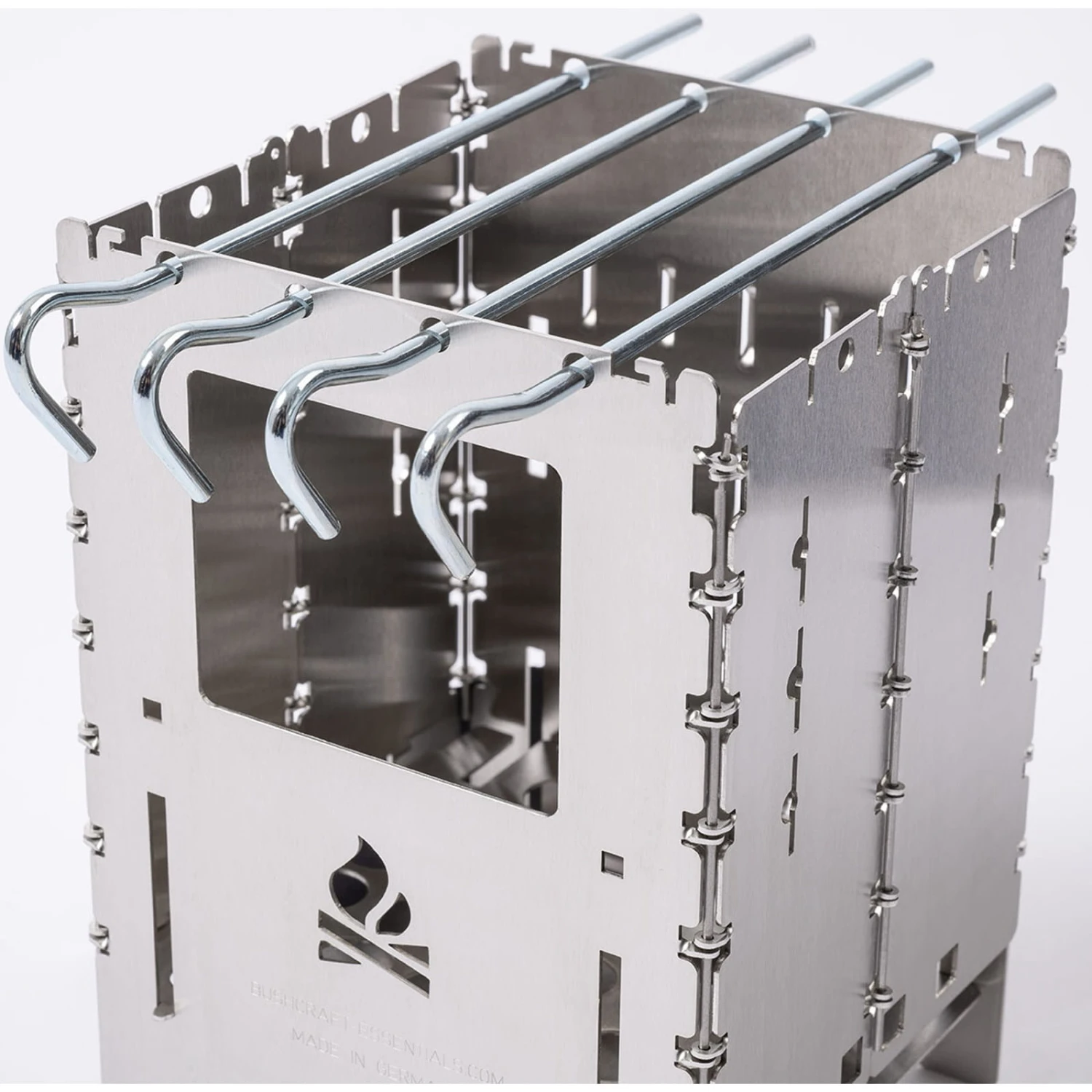 Der Bushbox XL von bushcraft essentials ist ein außerordentlich effizienter portabler Falt-Hobo-Kocher zum Grillen, Kochen, Wärmen. Zusammengefaltet nur ca. 1 cm dick. Perfekt für längere Outdoor-Trips, Camping, Trekking, Bushcraft, Biker, Expeditionen und und und… Unabhängig, vielfältig und einfach zu benutzen. Den Brennstoff gibt es kostenlos überall in der Natur – Zweige, Äste, Laub, Tierdung. Halteposition für Trangia Kocher. Zusammengeklappt ist dieser geniale Hobo-Ofen nur wenig dicker als 1 cm und lässt sich nahezu überall unterbringen. Der Bushbox XL wird an den Scharnieren einfach aufgeklappt und ist sofort einsatzbereit (er lässt sich auch mit Handschuhen oder klammen Händen problemlos aufbauen, was bereits auf Expeditionen unter Beweis gestellt wurde). Der Bushbox XL arbeitet nach dem Kamin-Prinzip: Luft strömt von unten in den Kocher, bringt sogar noch feuchtes Material zum Brennen und erzeugt starke Hitze, was weiter dadurch unterstützt wird, dass die Hitze im Gegensatz zu einer offenen Flamme kaum nach den Seiten abstrahlen kann und dadurch vorwiegend nach oben gelenkt wird. Der Bushbox XL ist ein Effizienzwunder. Schon mit wenigen kleinen Zweigen lässt sich Wasser in unter 4 Minuten zum Kochen bringen, Fleisch grillen, Essen zubereiten – und vieles mehr. Als Brennstoff kann neben praktisch jedem natürlichen bzw. festen Brennstoff wie Holz, Rinde, Holzkohle (sogar trockner Tierdung) auch ein Spiritusbrenner, Esbit-Tabletten oder ein Gel-Kocher verwendet werden. Durch zwei mitgelieferte Stäbe kann eine externe Wärmequelle (z.B. Trangia) auf jeder beliebigen Höhe in der Bushbox XL plaziert werden. Diese Stäbe lassen sich auch auf der Oberseite des Kochers einlegen, so dass auch kleine Gefäße erhitzt werden können. Die mitgelieferten, äußerst variabel einsetzbaren Topfauflagen können alternativ verwendet werden als Höhenregulierung beim Einsatz anderer Wärmequellen, Haltestäbe zum Transport oder Versetzen des heißen Kochers und Halterung für den Trangia-Brenner.