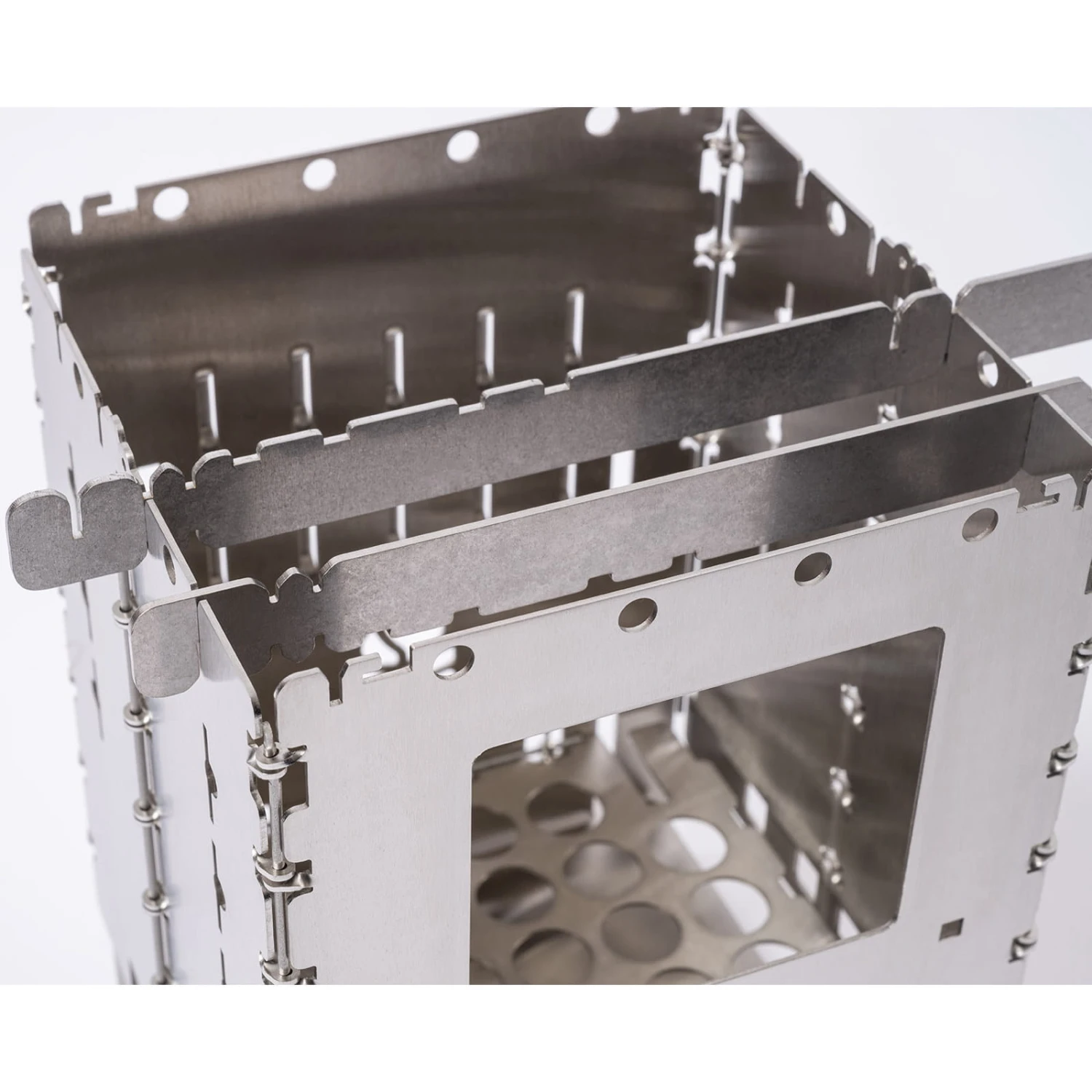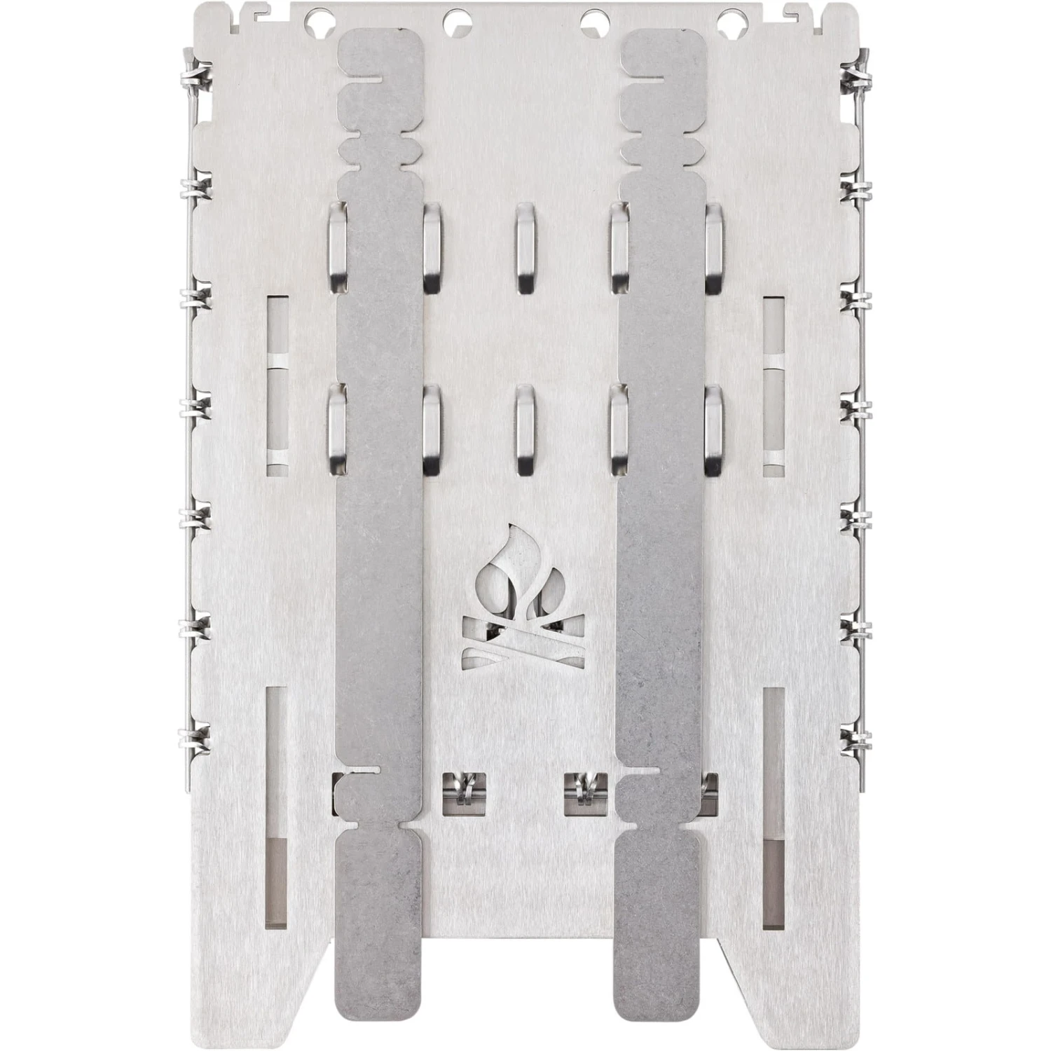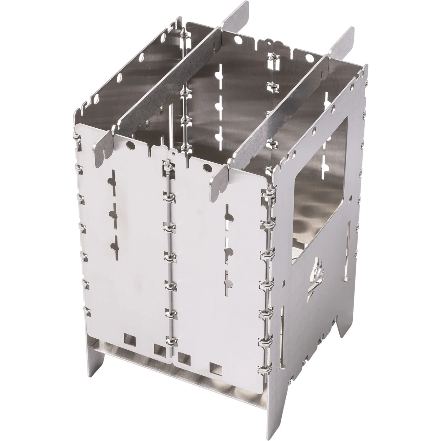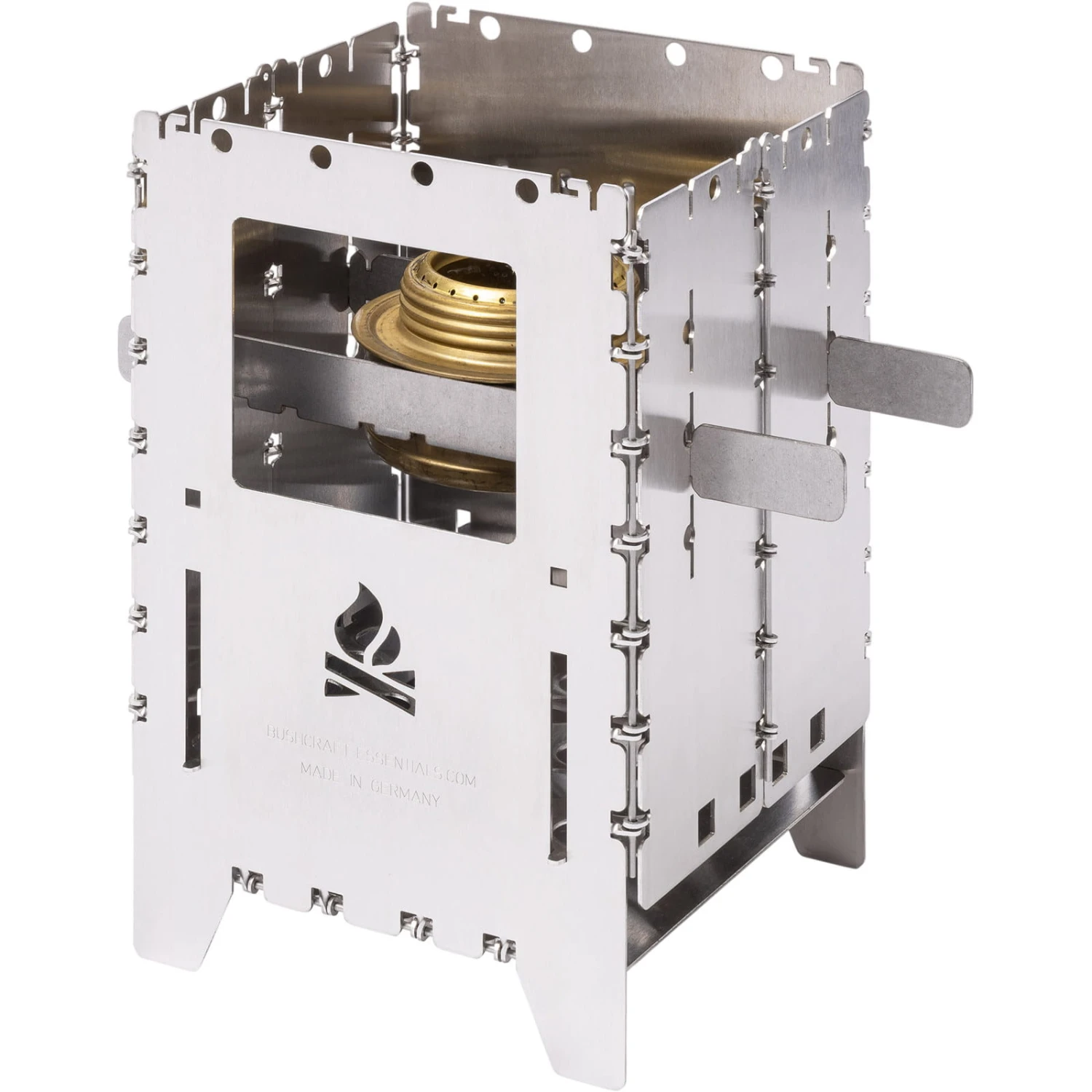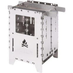 Der Bushbox XL von bushcraft essentials ist ein außerordentlich effizienter portabler Falt-Hobo-Kocher zum Grillen, Kochen, Wärmen. Zusammengefaltet nur ca. 1 cm dick. Perfekt für längere Outdoor-Trips, Camping, Trekking, Bushcraft, Biker, Expeditionen und und und… Unabhängig, vielfältig und einfach zu benutzen. Den Brennstoff gibt es kostenlos überall in der Natur – Zweige, Äste, Laub, Tierdung. Halteposition für Trangia Kocher. Zusammengeklappt ist dieser geniale Hobo-Ofen nur wenig dicker als 1 cm und lässt sich nahezu überall unterbringen. Der Bushbox XL wird an den Scharnieren einfach aufgeklappt und ist sofort einsatzbereit (er lässt sich auch mit Handschuhen oder klammen Händen problemlos aufbauen, was bereits auf Expeditionen unter Beweis gestellt wurde). Der Bushbox XL arbeitet nach dem Kamin-Prinzip: Luft strömt von unten in den Kocher, bringt sogar noch feuchtes Material zum Brennen und erzeugt starke Hitze, was weiter dadurch unterstützt wird, dass die Hitze im Gegensatz zu einer offenen Flamme kaum nach den Seiten abstrahlen kann und dadurch vorwiegend nach oben gelenkt wird. Der Bushbox XL ist ein Effizienzwunder. Schon mit wenigen kleinen Zweigen lässt sich Wasser in unter 4 Minuten zum Kochen bringen, Fleisch grillen, Essen zubereiten – und vieles mehr. Als Brennstoff kann neben praktisch jedem natürlichen bzw. festen Brennstoff wie Holz, Rinde, Holzkohle (sogar trockner Tierdung) auch ein Spiritusbrenner, Esbit-Tabletten oder ein Gel-Kocher verwendet werden. Durch zwei mitgelieferte Stäbe kann eine externe Wärmequelle (z.B. Trangia) auf jeder beliebigen Höhe in der Bushbox XL plaziert werden. Diese Stäbe lassen sich auch auf der Oberseite des Kochers einlegen, so dass auch kleine Gefäße erhitzt werden können. Die mitgelieferten, äußerst variabel einsetzbaren Topfauflagen können alternativ verwendet werden als Höhenregulierung beim Einsatz anderer Wärmequellen, Haltestäbe zum Transport oder Versetzen des heißen Kochers und Halterung für den Trangia-Brenner.