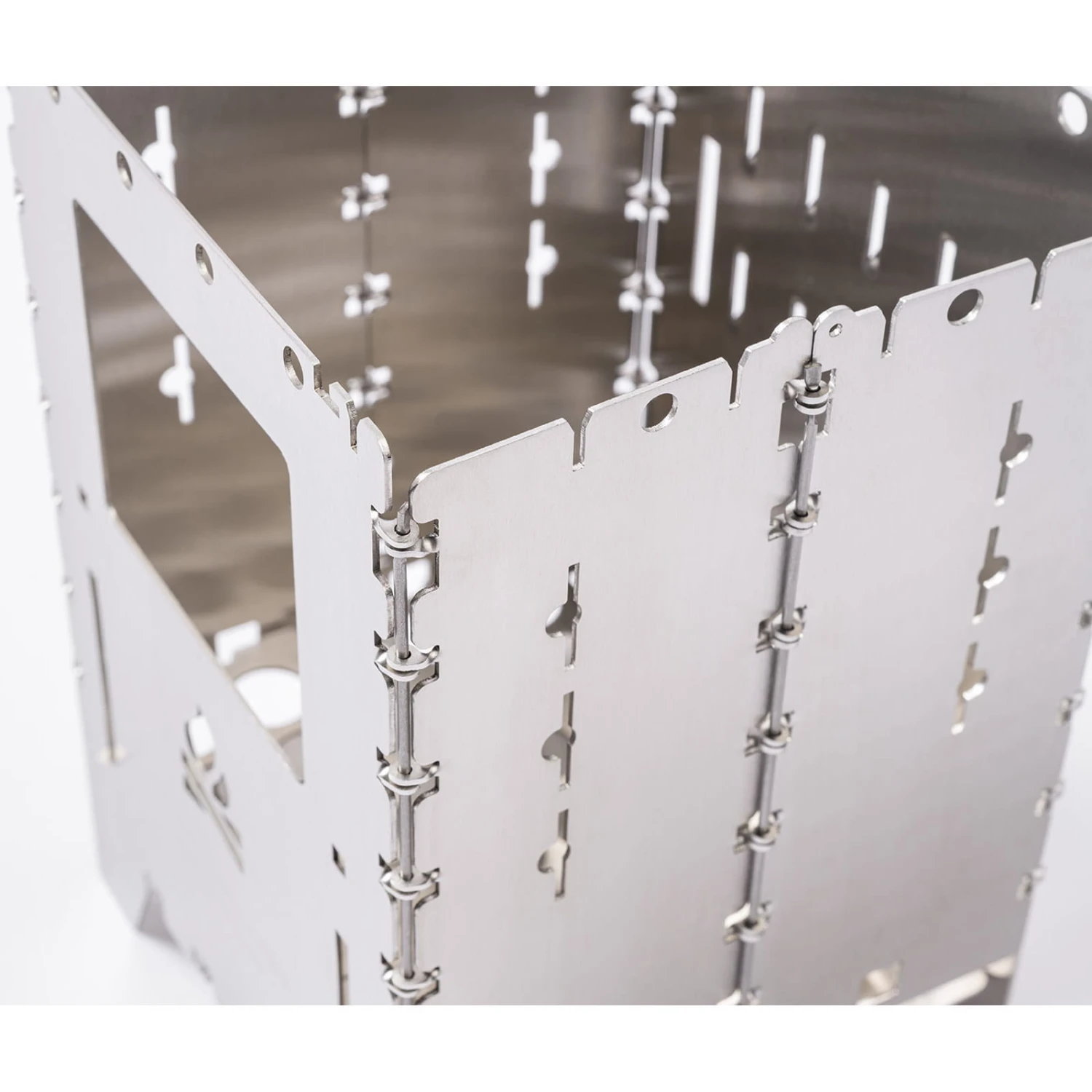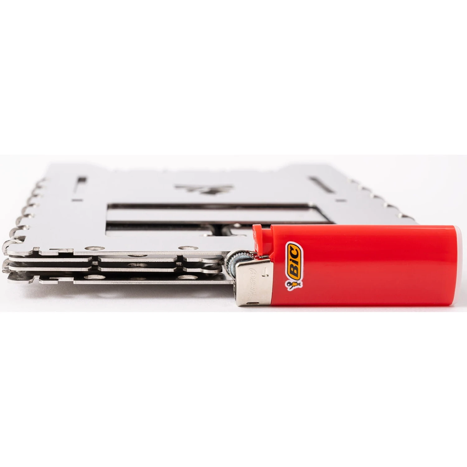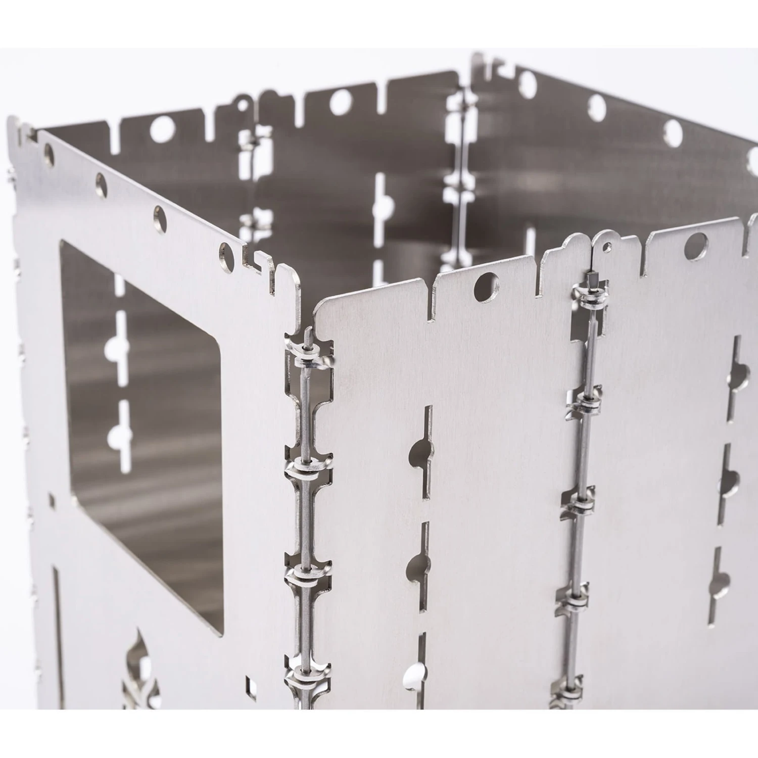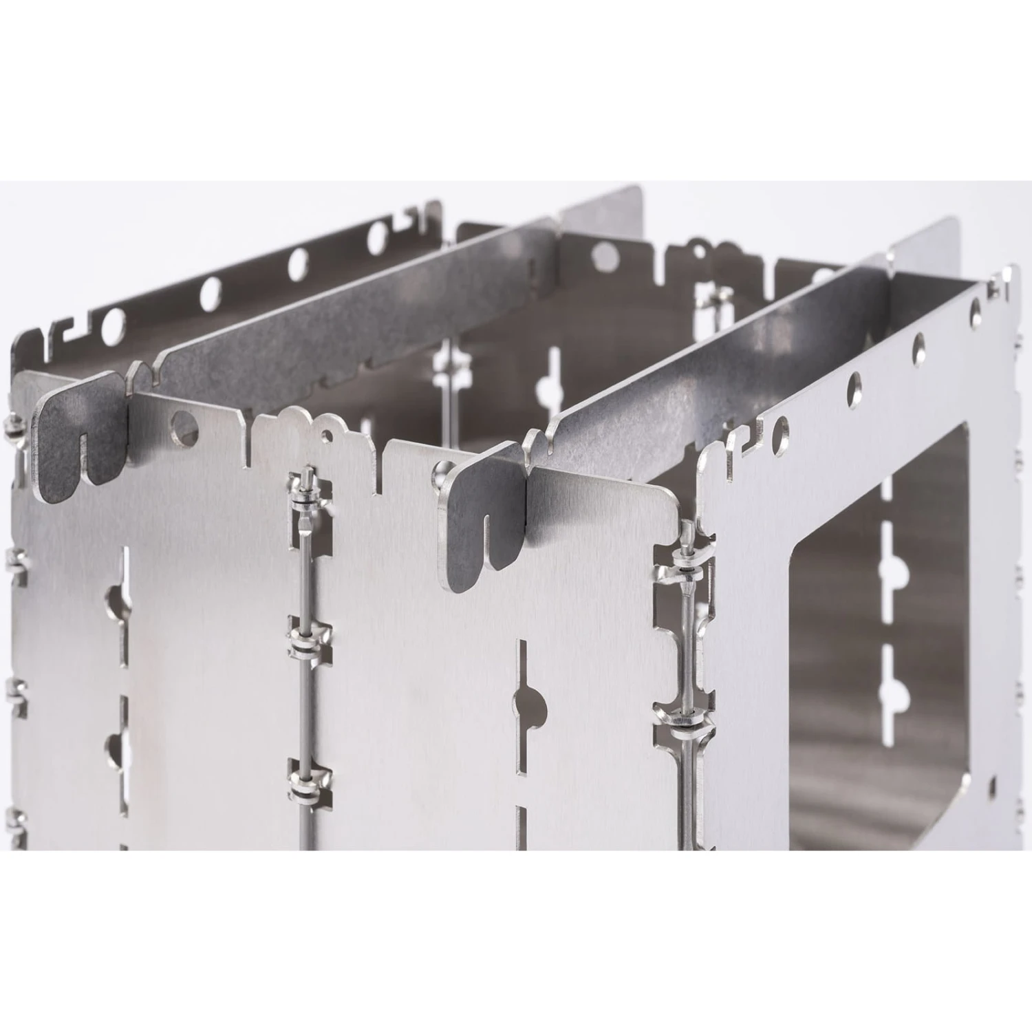 Der Bushbox XL von bushcraft essentials ist ein außerordentlich effizienter portabler Falt-Hobo-Kocher zum Grillen, Kochen, Wärmen. Zusammengefaltet nur ca. 1 cm dick. Perfekt für längere Outdoor-Trips, Camping, Trekking, Bushcraft, Biker, Expeditionen und und und… Unabhängig, vielfältig und einfach zu benutzen. Den Brennstoff gibt es kostenlos überall in der Natur – Zweige, Äste, Laub, Tierdung. Halteposition für Trangia Kocher. Zusammengeklappt ist dieser geniale Hobo-Ofen nur wenig dicker als 1 cm und lässt sich nahezu überall unterbringen. Der Bushbox XL wird an den Scharnieren einfach aufgeklappt und ist sofort einsatzbereit (er lässt sich auch mit Handschuhen oder klammen Händen problemlos aufbauen, was bereits auf Expeditionen unter Beweis gestellt wurde). Der Bushbox XL arbeitet nach dem Kamin-Prinzip: Luft strömt von unten in den Kocher, bringt sogar noch feuchtes Material zum Brennen und erzeugt starke Hitze, was weiter dadurch unterstützt wird, dass die Hitze im Gegensatz zu einer offenen Flamme kaum nach den Seiten abstrahlen kann und dadurch vorwiegend nach oben gelenkt wird. Der Bushbox XL ist ein Effizienzwunder. Schon mit wenigen kleinen Zweigen lässt sich Wasser in unter 4 Minuten zum Kochen bringen, Fleisch grillen, Essen zubereiten – und vieles mehr. Als Brennstoff kann neben praktisch jedem natürlichen bzw. festen Brennstoff wie Holz, Rinde, Holzkohle (sogar trockner Tierdung) auch ein Spiritusbrenner, Esbit-Tabletten oder ein Gel-Kocher verwendet werden. Durch zwei mitgelieferte Stäbe kann eine externe Wärmequelle (z.B. Trangia) auf jeder beliebigen Höhe in der Bushbox XL plaziert werden. Diese Stäbe lassen sich auch auf der Oberseite des Kochers einlegen, so dass auch kleine Gefäße erhitzt werden können. Die mitgelieferten, äußerst variabel einsetzbaren Topfauflagen können alternativ verwendet werden als Höhenregulierung beim Einsatz anderer Wärmequellen, Haltestäbe zum Transport oder Versetzen des heißen Kochers und Halterung für den Trangia-Brenner.
