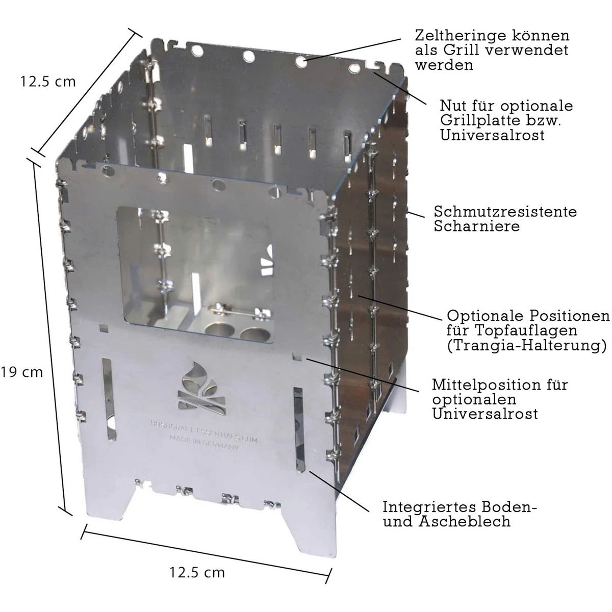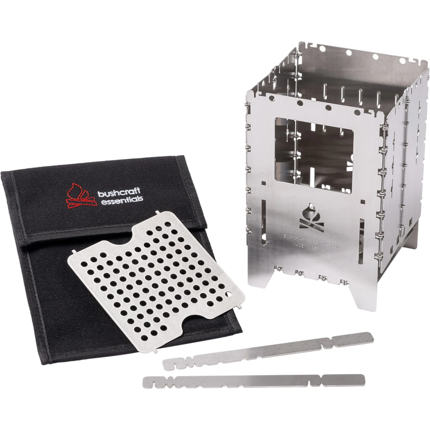 Der Bushbox XL von bushcraft essentials ist ein außerordentlich effizienter portabler Falt-Hobo-Kocher zum Grillen, Kochen, Wärmen. Zusammengefaltet nur ca. 1 cm dick. Perfekt für längere Outdoor-Trips, Camping, Trekking, Bushcraft, Biker, Expeditionen und und und… Unabhängig, vielfältig und einfach zu benutzen. Den Brennstoff gibt es kostenlos überall in der Natur – Zweige, Äste, Laub, Tierdung. Halteposition für Trangia Kocher. Zusammengeklappt ist dieser geniale Hobo-Ofen nur wenig dicker als 1 cm und lässt sich nahezu überall unterbringen. Der Bushbox XL wird an den Scharnieren einfach aufgeklappt und ist sofort einsatzbereit (er lässt sich auch mit Handschuhen oder klammen Händen problemlos aufbauen, was bereits auf Expeditionen unter Beweis gestellt wurde). Der Bushbox XL arbeitet nach dem Kamin-Prinzip: Luft strömt von unten in den Kocher, bringt sogar noch feuchtes Material zum Brennen und erzeugt starke Hitze, was weiter dadurch unterstützt wird, dass die Hitze im Gegensatz zu einer offenen Flamme kaum nach den Seiten abstrahlen kann und dadurch vorwiegend nach oben gelenkt wird. Der Bushbox XL ist ein Effizienzwunder. Schon mit wenigen kleinen Zweigen lässt sich Wasser in unter 4 Minuten zum Kochen bringen, Fleisch grillen, Essen zubereiten – und vieles mehr. Als Brennstoff kann neben praktisch jedem natürlichen bzw. festen Brennstoff wie Holz, Rinde, Holzkohle (sogar trockner Tierdung) auch ein Spiritusbrenner, Esbit-Tabletten oder ein Gel-Kocher verwendet werden. Durch zwei mitgelieferte Stäbe kann eine externe Wärmequelle (z.B. Trangia) auf jeder beliebigen Höhe in der Bushbox XL plaziert werden. Diese Stäbe lassen sich auch auf der Oberseite des Kochers einlegen, so dass auch kleine Gefäße erhitzt werden können. Die mitgelieferten, äußerst variabel einsetzbaren Topfauflagen können alternativ verwendet werden als Höhenregulierung beim Einsatz anderer Wärmequellen, Haltestäbe zum Transport oder Versetzen des heißen Kochers und Halterung für den Trangia-Brenner. Nutzern, die das Bushbox XL Profi Set in Kombination mit Trangiakochern verwenden möchten, empfehlen wir die Bestellung eines ZUSÄTZLICHEN Topfauflagen-Sets.