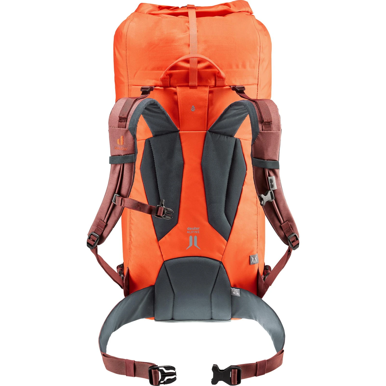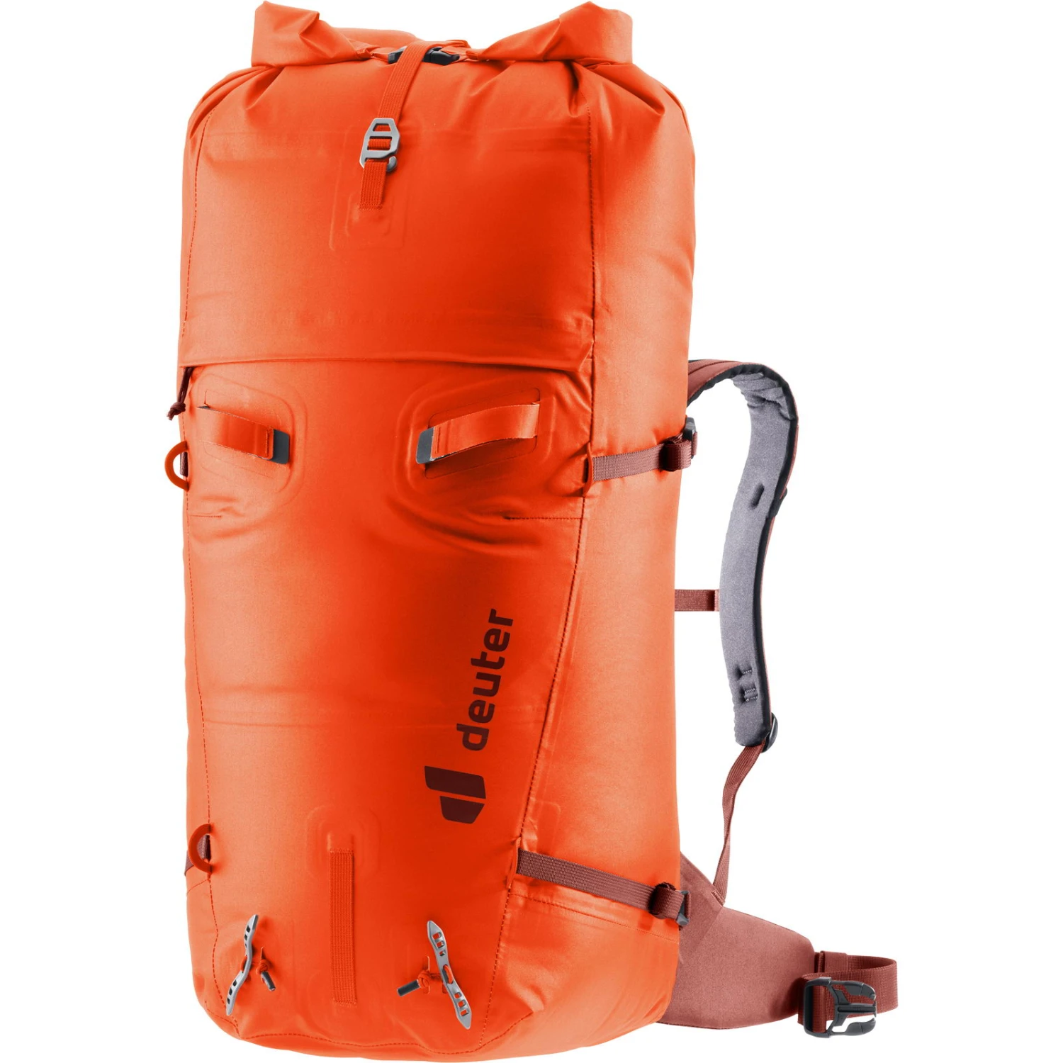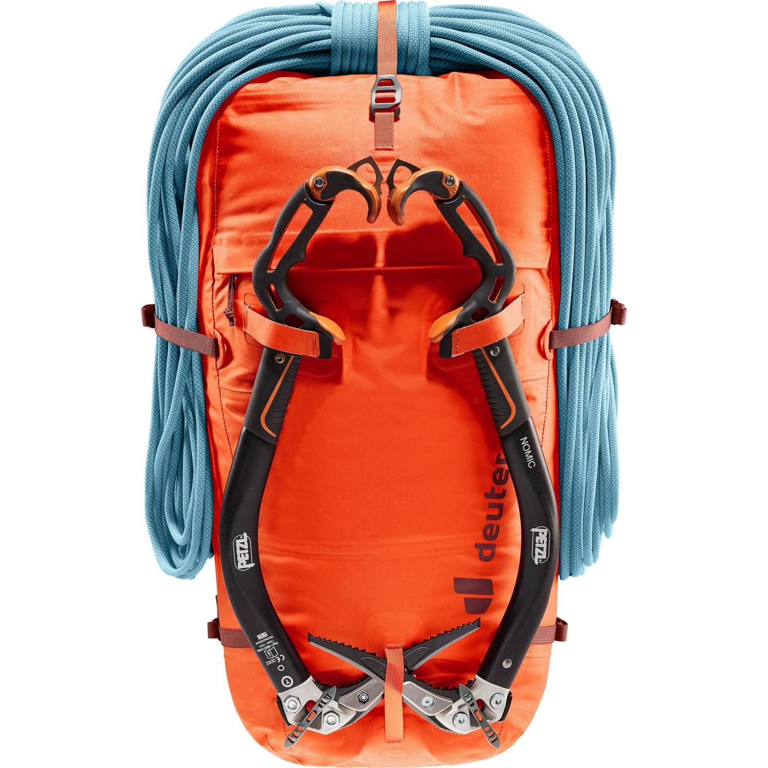 | Merkmale | Brustgurt mit Signalpfeife, Eisgerätehalterung, Frontfach mit Reißverschluss, Lastkontrollriemen, Materialschlaufen auf den Schulterträgern für Brille etc., Pickelhalterung, Rollverschluss (Wickelverschluss), Schlaufen für Helmhalterung (Halterung optional), Schlüsselclip, Seilfixierung oben, seitliche Kompressionsriemen, SOS Notfallhinweise, Stockhalterung, stufenlos verstellbarer Brustgurt, Trageschlaufe hinten oben, verstaubarer Hüftgurt, Volumenerweiterung durch Roll-Top um 10 Liter |