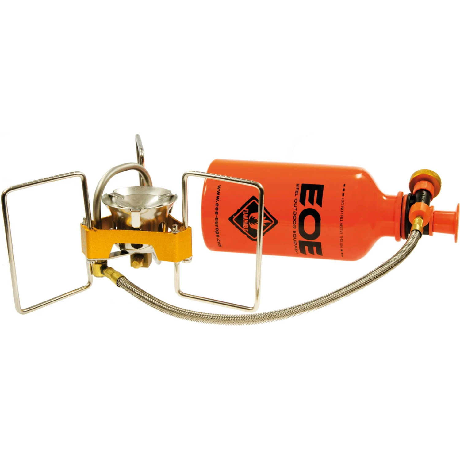 Auch mit dem ersten Benzinkocher will EOE bezüglich des Gewichts neue Maßstäbe setzen – mit 230g inkl. der Pumpe trifft der EOE Thorium auf dem Markt kaum seinesgleichen. Auch das Packmaß überzeugt im Vergleich zu der großen Auflagefläche im aufgeklappten Zustand. Er vereint damit beide Ansprüche, die EOE an seine Kocher stellt: geringes Gewicht und stabilen Stand. Seine Stärken spielt er dort aus, wo es schwierig sein kann an passende Gaskartuschen zu kommen, oder wenn es mal richtig kalt wird.