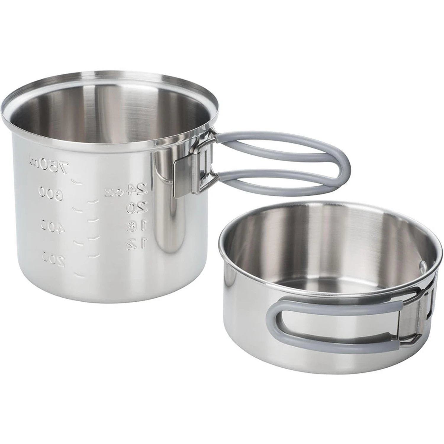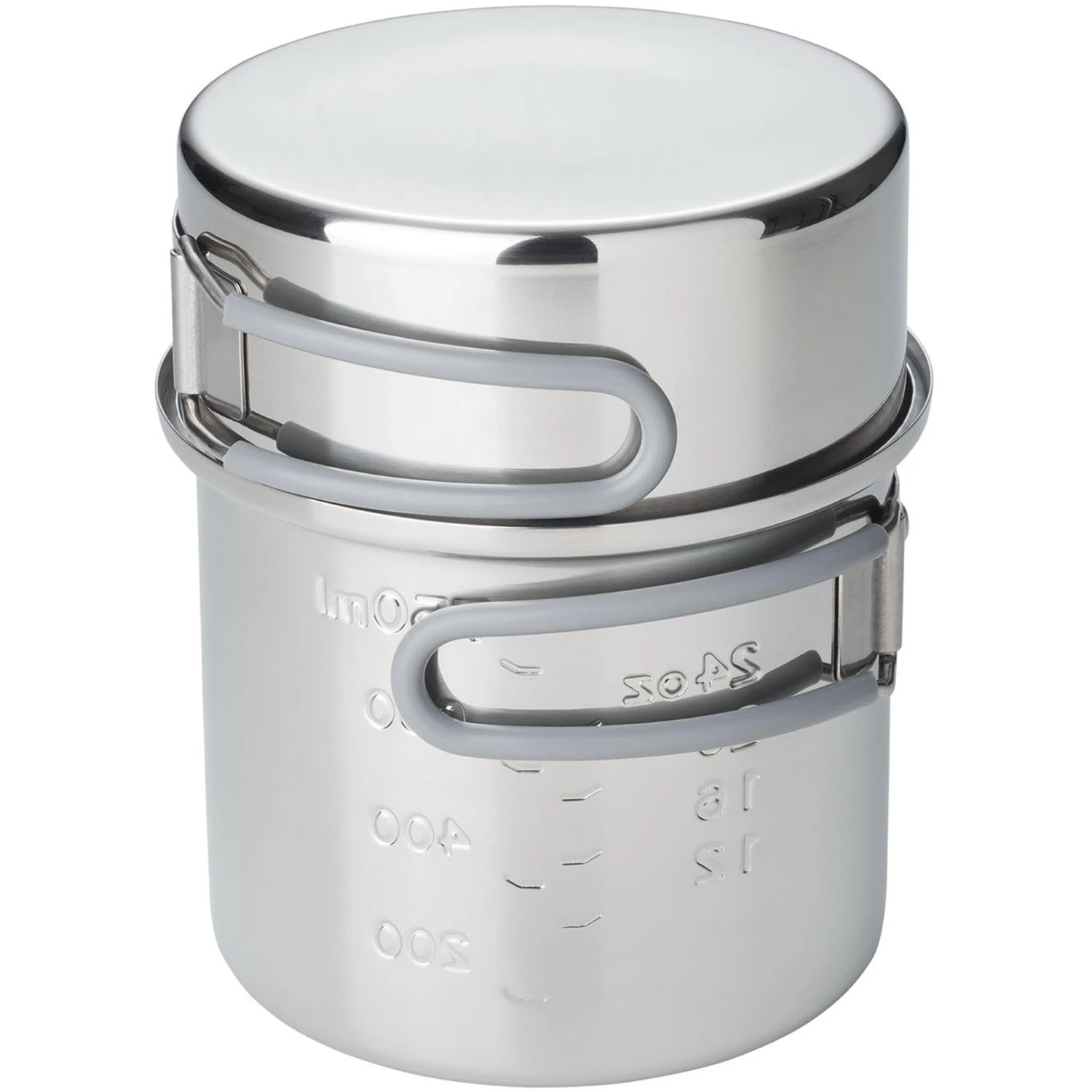 Für Touren in Begleitung oder den größeren Hunger ist er unverzichtbar: Der große Edelstahl-Topf mit seinem Fassungsvermögen von ca. 1 Liter. Aber er kann noch mehr … Dieser Topf aus hochwertigem Edelstahl ist mehr als nur ein Topf. Er ist sogar zwei Töpfe! Zumindest wenn Sie es wollen. Denn der Deckel des großen Topfes lässt sich ebenfalls als Topf verwenden. Er fasst ca. 475 ml und ist somit ideal für Saucen. Eine ideale Kombination also für nahezu jeden Geschmack. Beide Töpfe lassen sich dank klappbarer Edelstahlgriffe einfach und platzsparend verstauen. Der große Topf verfügt über eine Volumenanzeige in Oz und Litern. Zum Lieferumfang gehört ein praktischer Netzbeutel.