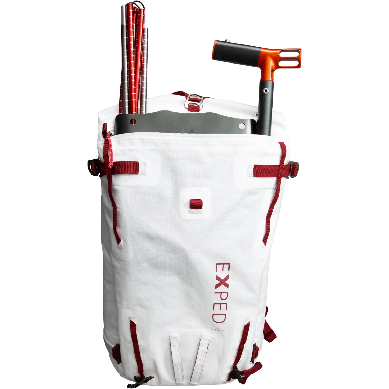 Der Icefall 30 von EXPED ist ein robuster und geräumiger alpiner Touren-Rucksack der Extraklasse. Der wetterfeste Alpinrucksack wendet sich an Bergsportprofis, die zu allen Jahreszeiten im alpinen Gelände unterwegs sind und dafür einen zuverlässigen und geräumigen Begleiter suchen. Der Tourenrucksack hat eine neu konzipierte Fixierung für Stöcke, Pickel, Eisgerät und Ski und ein geräumiges Frontfach für den schnellen Zugriff auf die LVS-Ausrüstung. Um das Gewicht des Icefall 30 auf ein Minimum zu reduzieren, lassen sich Kompressionsriemen und weitere Features einfach abnehmen. Für einen einfachen und schnellen Zugriff auf die Ausrüstung lässt sich das geräumige Hauptfach nicht nur von oben per Rollverschluss, sondern auch über einen seitliche Reißverschluss-Öffnung erreichen. In Kombination mit dem weißen, kontraststarken Material, das für ein schnelleres Auffinden des Rucksackinhalts sorgt, bietet der Icefall 30 anspruchsvollen Alpinisten die bestmögliche Performance. Der robuste Alpinrucksack ist aus bluesign®-zertifiziertem und eigens für EXPED hergestelltem UHMPE-Gewebe, das sehr leicht, aber auch äußerst abrieb- und reißfest ist. Mit dem Icefall 30 wird das Thema Alpinrucksäcke neu definiert, insbesondere, was das Verhältnis von Langlebigkeit zu Gewicht angeht.