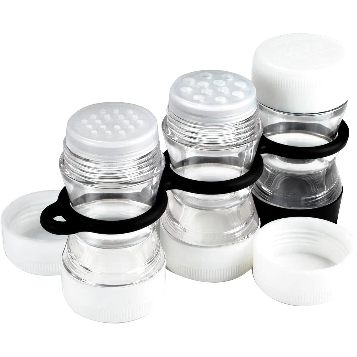 Gewürztransport einfach gemacht. Drei der beidseitig befüllbaren, äußerst stabilen Streuer sind hier zu einem Mini-Gewürzregal verbunden. Optimal für unterwegs, im Wohnwagen oder Wohnmobil.