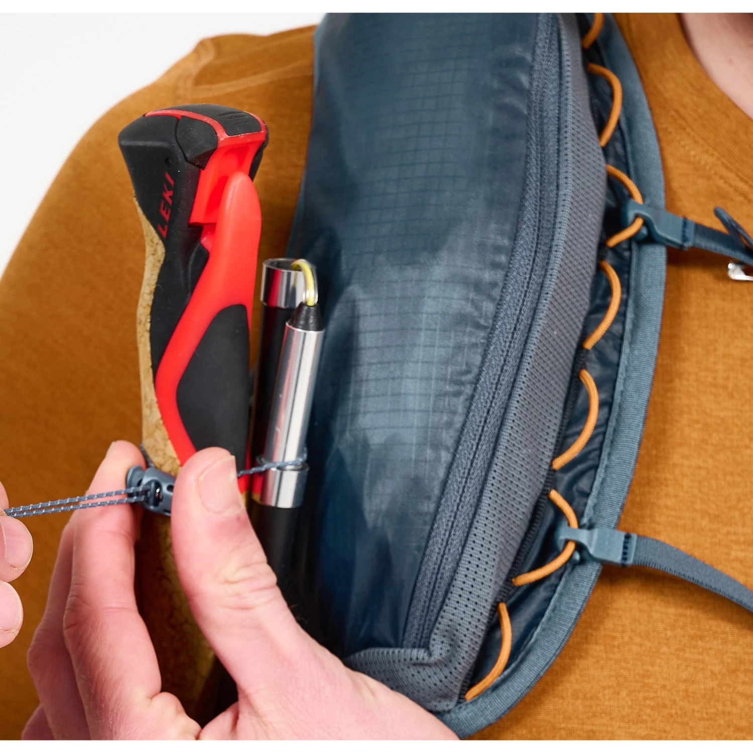 | Merkmale | Brustgurt abnehmbar, Einschubfach innen, elastische Gummizughalterung vorne, Halterung für Trinkblase, höhenverstellbarer Brustgurt, Materialschlaufen auf den Schulterträgern für Brille etc., Rollverschluss, Stockhalterung, Tragegriff oben, zwei elastische Seitentaschen, zwei Reißverschlussfächer auf den Schulterträgern |