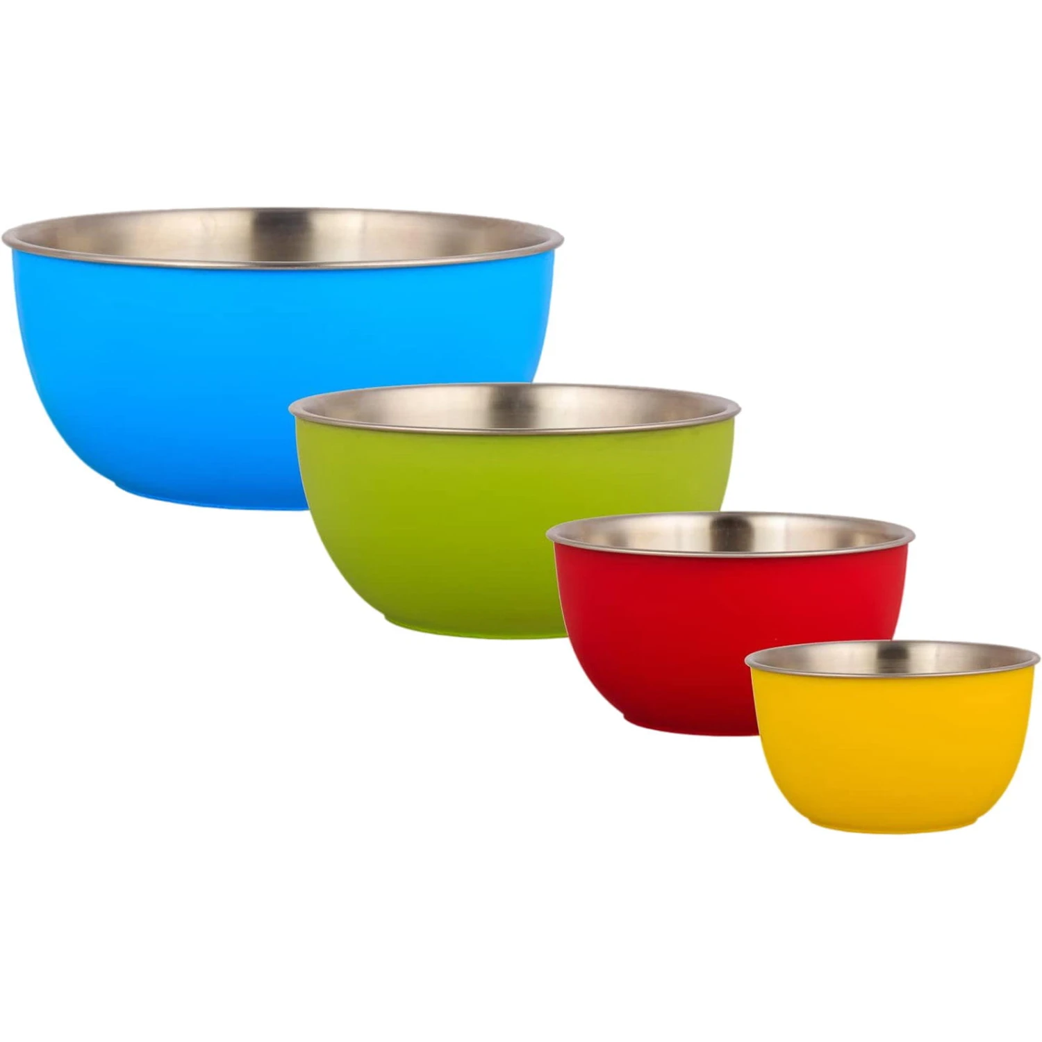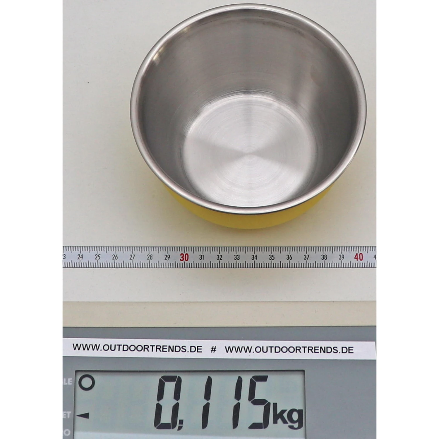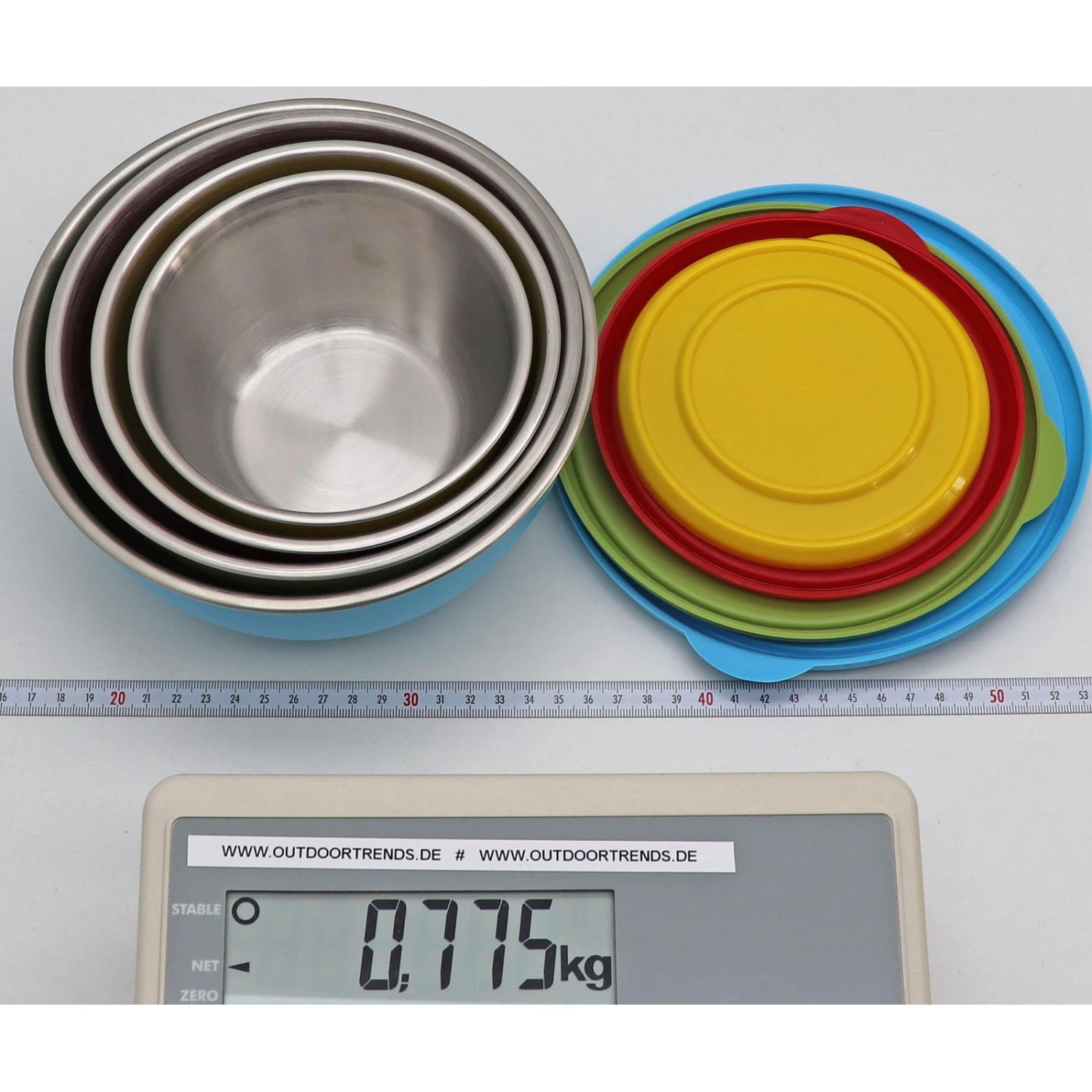 Edelstahlschüssel-Set von Origin Outdoors in praktischen Größen Ø 13 cm, Ø 15 cm, Ø 17 cm und Ø 19 cm. Außen mit robuster Kunststoffhülle in verschiedenen Farben und innen aus rostfreiem Edelstahl. Diese sind im leeren Zustand stapelbar, platzsparend verstaubar, gefrier- und spülmaschinenfest. Ausgestattet mit passendem Kunststoffdeckel.