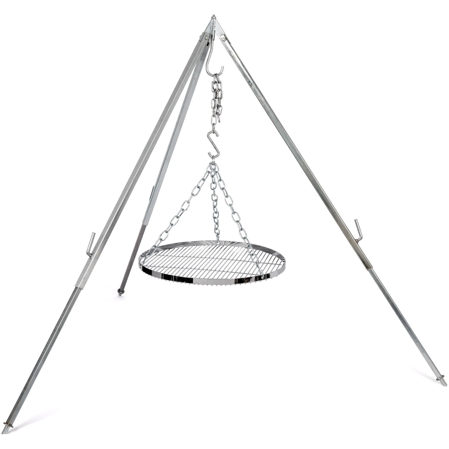 Mit dem Hänge-Rost h-grate50 für das Petromax Dreibein (nicht im Lieferumfang) wird auf ursprüngliche Art Fleisch und Gemüse direkt über dem Feuer gegrillt. Dabei nehmen Steak, Filet & Co. die Aromen des Holzfeuers auf, bleiben gleichzeitig dennoch besonders saftig. Denn der an drei Ketten aufgehängte Grillrost aus verchromtem Stahl pendelt stehts leicht über der Kochstelle und so wird das Grillgut wie bei einem Schwenkgrill schonend zubereitet. Auch die Optik überzeugt, da sich durch den Rost das typische Grillmuster auf die Mahlzeit überträgt. Der Hänge-Rost wird an dem Dreibein-Haken sicher und einfach eingehängt und der Abstand zur Feuerstelle kann damit jederzeit eingestellt werden. Zusätzlich schützt der erhöhte Rand vor einem Herabrollen von z. B. Bratwürsten und mit einem Durchmesser von gut 50 cm bleibt ausreichend Platz, um den Abenteuerhunger zu stillen.
