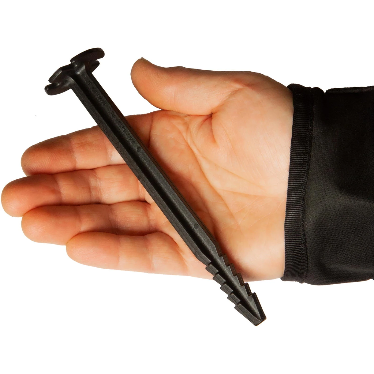 Die BF150 von SwissPiranha sind federleichte, stabile und umweltfreundliche Kunststoff Zeltheringe. Die Heringe sind bestens geeignet für harte wie auch weiche Böden und können für mittelgroße Zelte (3-6 Personen), größere Tarps, Vorzelte, Pavillons, etc. verwendet werden. Die BF150 sind aus der BlackFisk-Serie von SwissPiranha und die ersten Zeltheringe aus 100% recyceltem Kunststoff. Die Produktion liegt in der Schweiz und als Rohstoff kommen Kunststoffe zum Einsatz, die nur einen Bruchteil an Energie als herkömmliches Aluminium benötigen. BlackFisk-Heringe werden aus dem recyceltem Kunststoff PiranhaREC hergestellt. Als Basis verwendet SwissPiranha Angussreste aus ihrer Produktion, alte Heringe, sowie zugekauftes Recyclinggranulat. Zudem werden auch ausgemusterte und defekte SwissPiranha-Heringe zurückgenommen, um ihnen ein neues Leben einzuhauchen.
