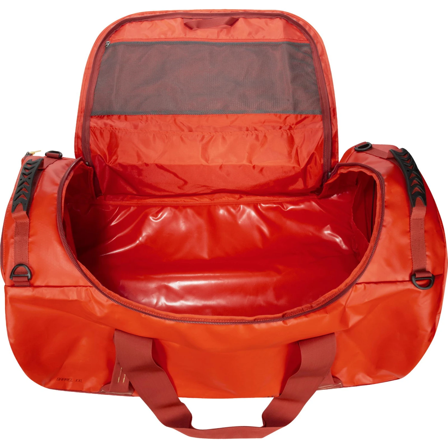 Extrem robuste und sportliche Reisetasche in Barrel in der Größe XXL (130 Liter Packvolumen) von Tatonka. Mit der Materialmischung aus Tarpaulin und Textreme gehört der Barrel XXL zu den Unverwüstlichen unter den Reisetaschen. Das Modell besitzt einen gepolsterten Boden, eine Netztasche unter dem Deckel und extrabreite Hand- und Schulterschlaufen. Zudem verfügt der Barrel XXL über zwei gepolsterte Schultergurte, die sich in einer versteckten Tasche komplett verstauen lassen und mit denen die Tasche wie ein Rucksack geschultert werden kann.