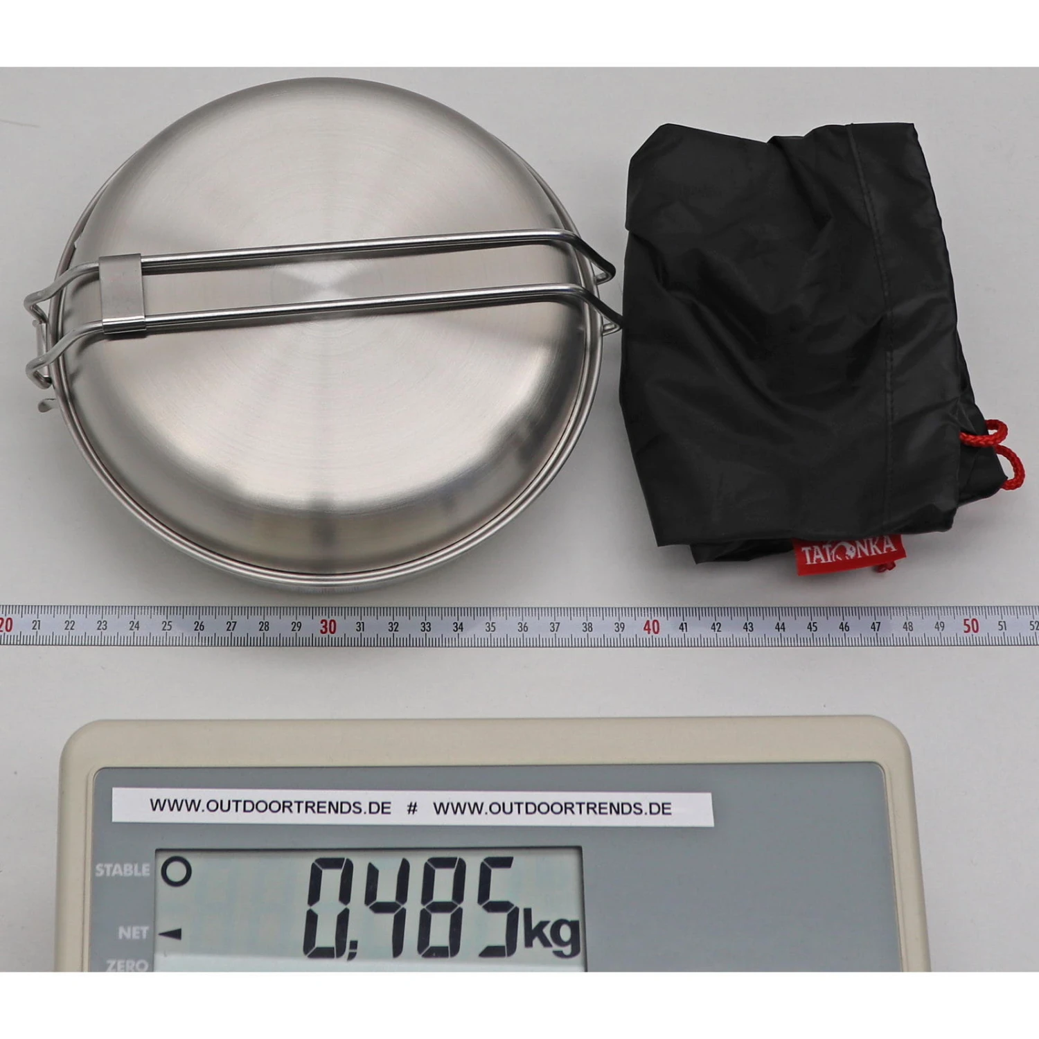 Das Campinggeschirr Camp Set Regular von Tatonka besteht insgesamt aus vier Teilen. Dabei sind Topf, Pfanne und Schale des Kochgeschirrs ineinander gestellt und ermöglichen so den Transport des kompletten Sets auf minimalem Raum. Der Topf bietet 0,6 Liter Volumen (randvoll) und eine Volumenskalierung. Das Set ist in einem praktischen Transportbeutel verpackt. Der 18/8 Edelstahl des Tatonka Camp Set Regular ist rostfrei, robust und lebensmittelecht.