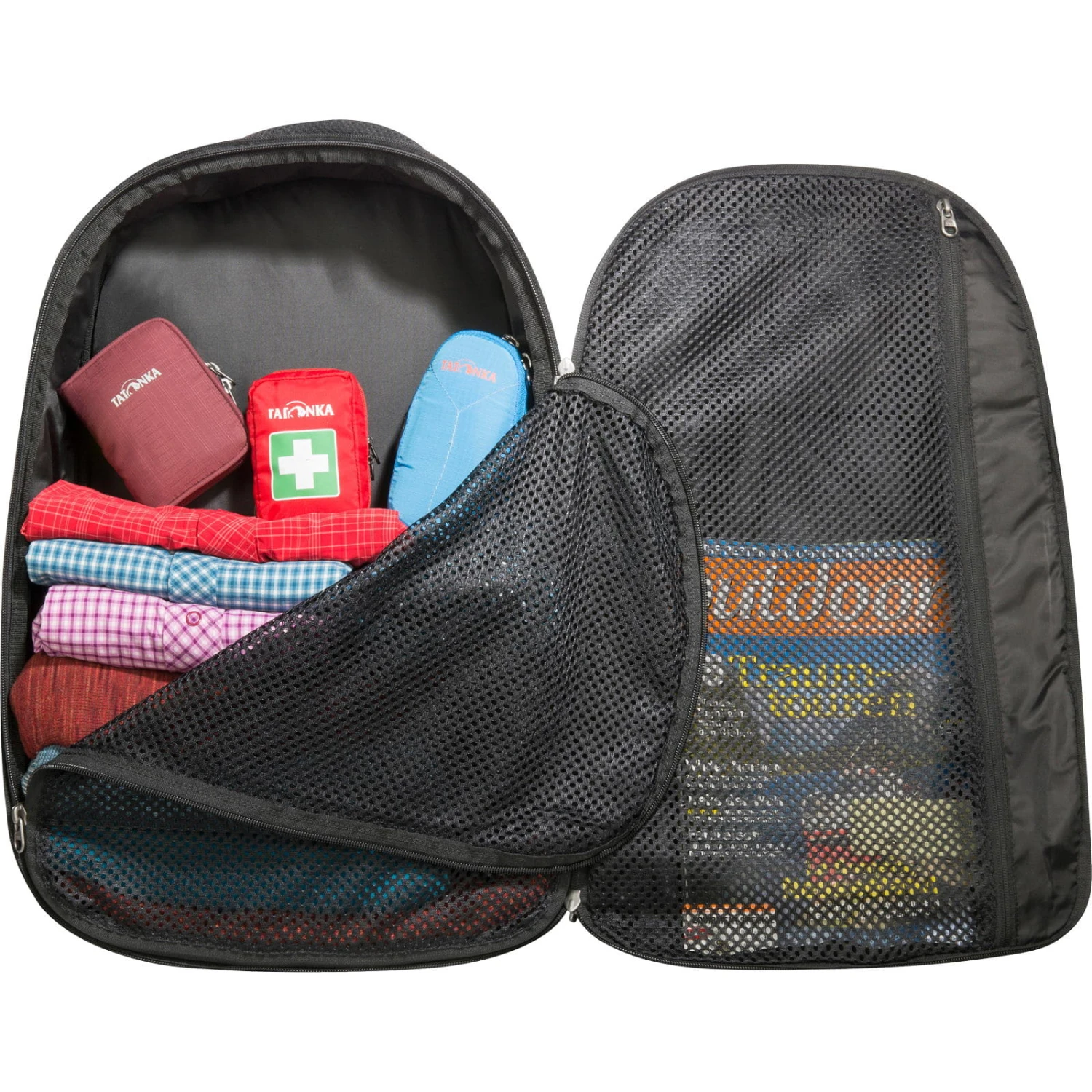 Die Flightcase von Tatonka ist eine handliche Reisetasche mit verstaubarem Rucksack-Tragesystem. Die handgepäcktaugliche Flightcase präsentiert sich nun in neuem, attraktivem Design – abgestimmt auf den großen Reiserucksack Great Escape. Der neue, thermogeformte Rucksackrücken schmiegt sich kraftschlüssig an den Körper und macht das Flightcase um einiges leichter. Neben dem Hauptfach steht für den Laptop ein von außen zugängliches Laptopfach zur Verfügung, und Reisedokumente werden in der flachen Fronttasche verstaut. Mit abgedecktem Tragesystem wird das Flightcase ruckzuck zum Rucksack.Ein Schultergurt kann nachgerüstet werden, hier eignet sich jeder der zwei Kaabiner dran hat und entsprechend lang genug ist.