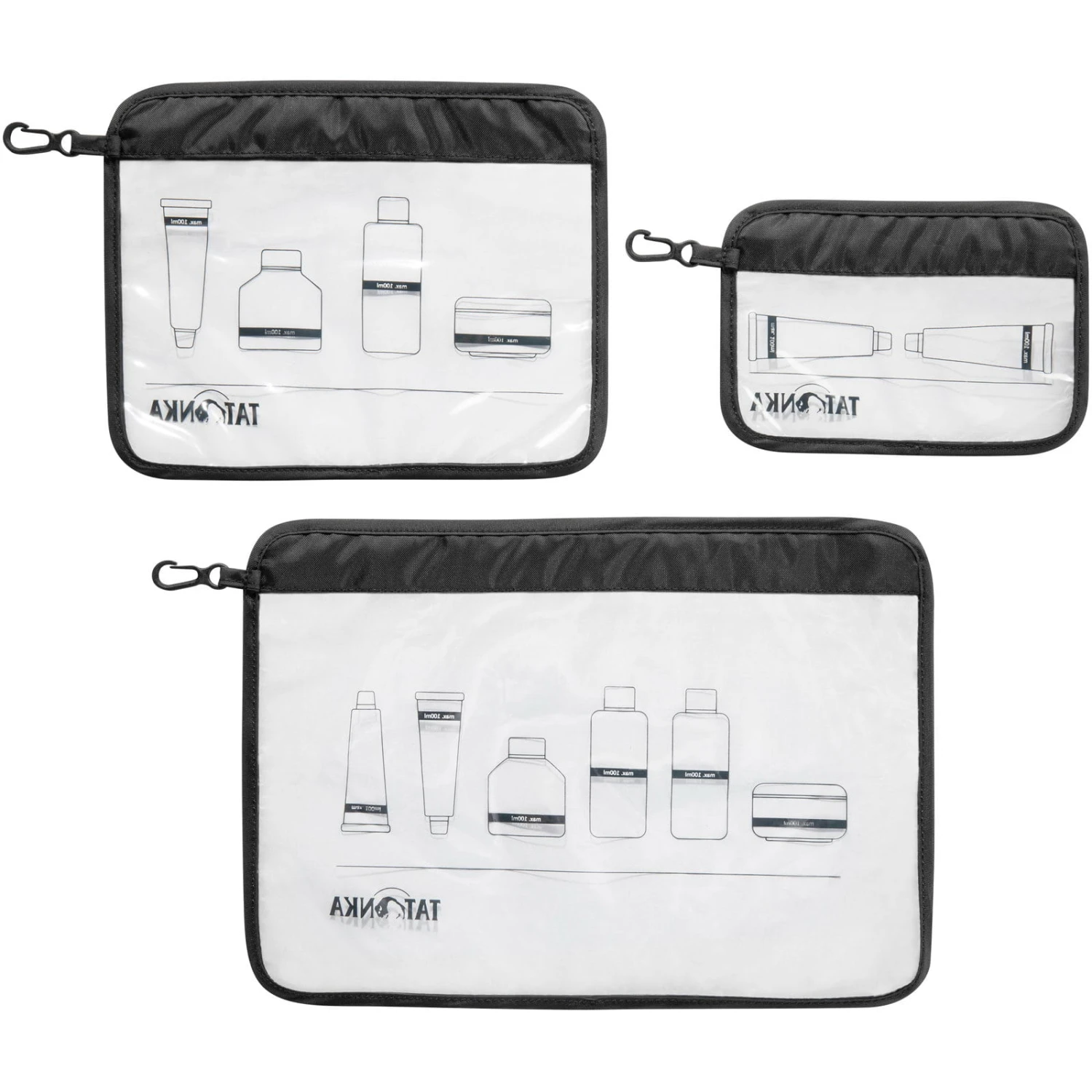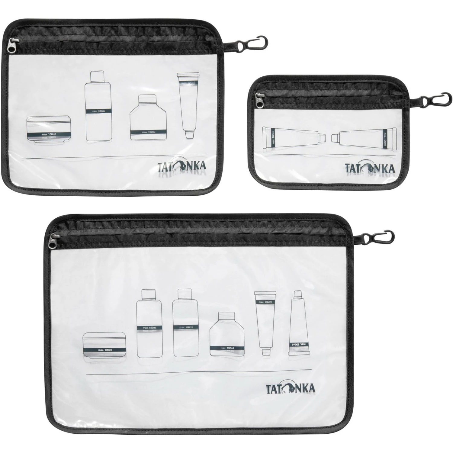 Das Zip Flight Bag Set von Tatonka enthält drei transparente Kulturtaschen in den Größen A4, A5 und A6, diese entsprechen aktuellen Richtlinien für die Mitnahme von Flüssigkeiten im Handgepäck: Sie sind durchsichtig und wiederverschließbar und verstauen Einzelbehältnisse bis 100 ml. Die hochwertigen Zip-Beutel sind mit einem Reißverschluss und einem Klipphaken zum Aufhängen versehen.